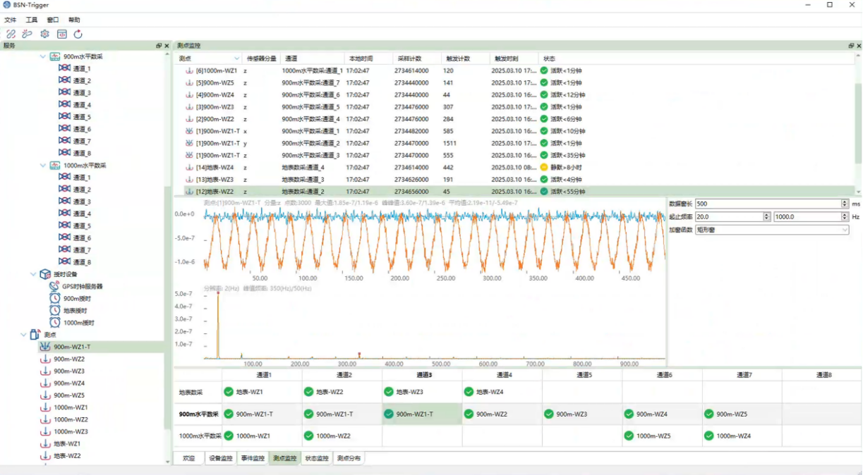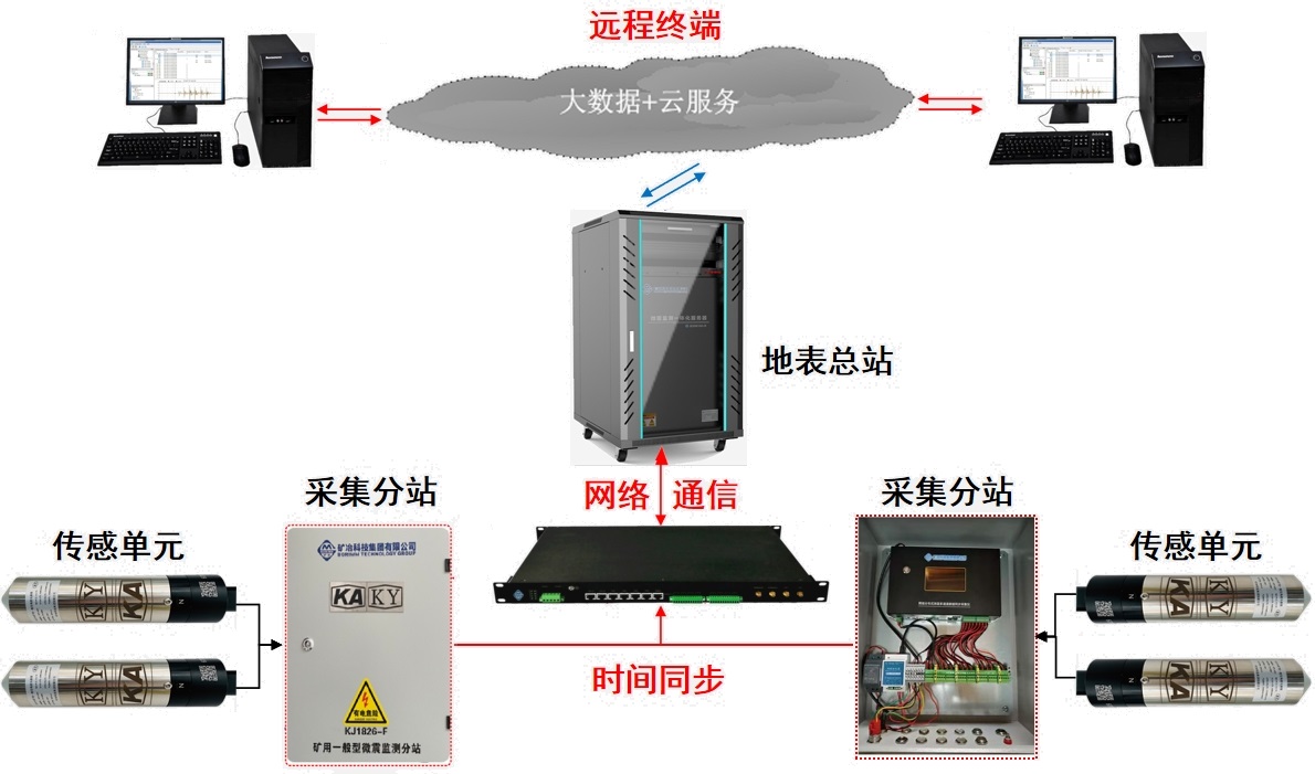 远程终端:远程在线数据处理与分析服务;地表总站:本地化处理、分析及展示服务;网络通讯:网络化数据通信与时钟同步;采集分站:数据采集、存储、传输单元;传感器:高灵敏度、高信噪比感知。