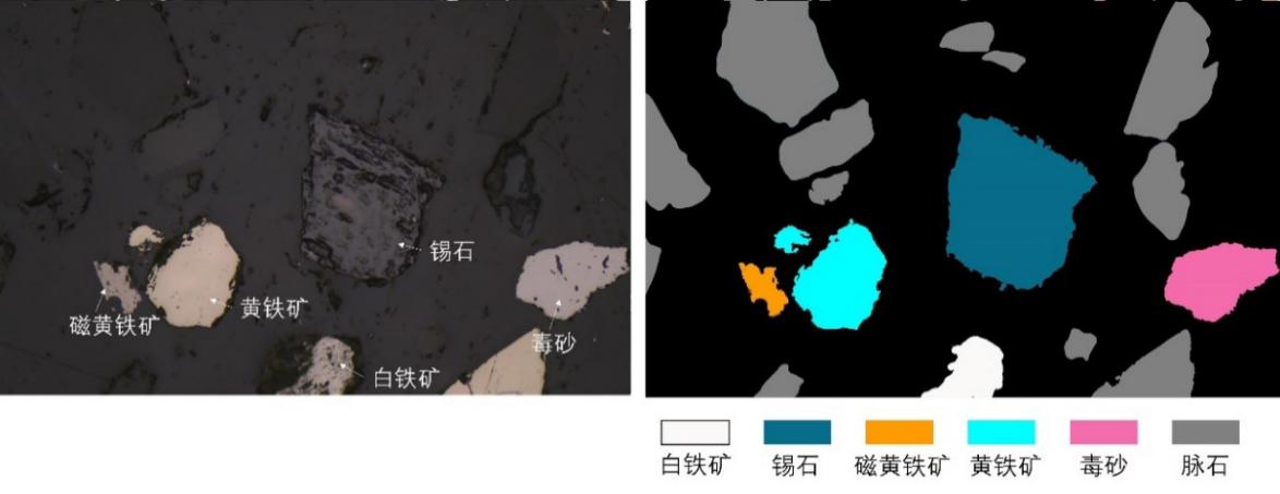 图2 矿物智能识别效果对比图(左:原始显微镜图像;右:MCPAS自动识别标注不同矿物的伪彩图)