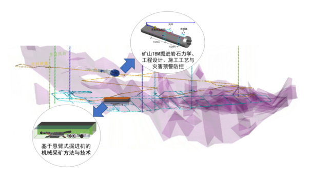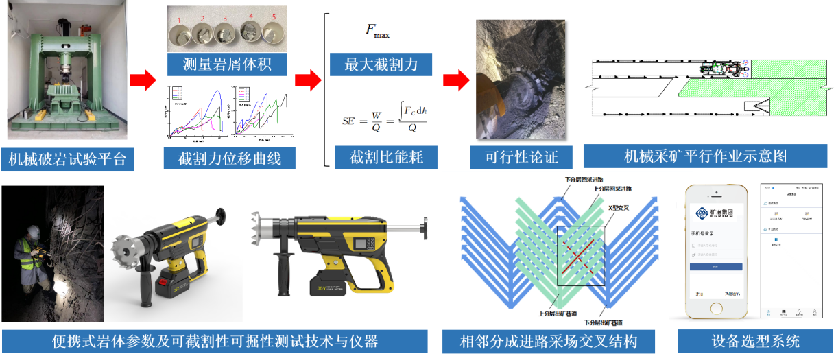 金属非金属矿山“凿岩爆破”开采方式决定了采矿工艺流程无法实现连续作业,而且爆破作业本身具有有害效应与较高安全风险。随着科技水平的发展,煤矿采煤机械、金属非金属矿山采掘机械及全断面隧道掘进机(TBM)等装备与技术相互影响渗透,机械破岩装备向着行业、技术融合的趋势进步,地下矿山迎来了由传统凿岩爆破开采向非爆机械连续开采的新跨越。机械连续开采技术是OD(中国)官方的重点发展方向。技术方向在机械刀具破岩力学及优化、机械采矿岩石力学、机械采矿工艺、机械采矿机电一体化选型配套、机械开挖岩体稳定性控制及安全保障技术、金属非金属专用机械采掘装备等方面取得了众多创新研究成果,研发形成多项自主知识产权的新一代机械采矿装备及配套产品,构建出一套机械连续采矿的基础理论与技术体系。自主研发的机械破岩试验平台、机械破岩装备选型系统、新型机械破岩悬臂式采矿机、便携式可截割性测试分析仪等,已在众多项目中起到关键支撑作用,并在国内多家地下金属非金属矿山中实现了推广与应用。