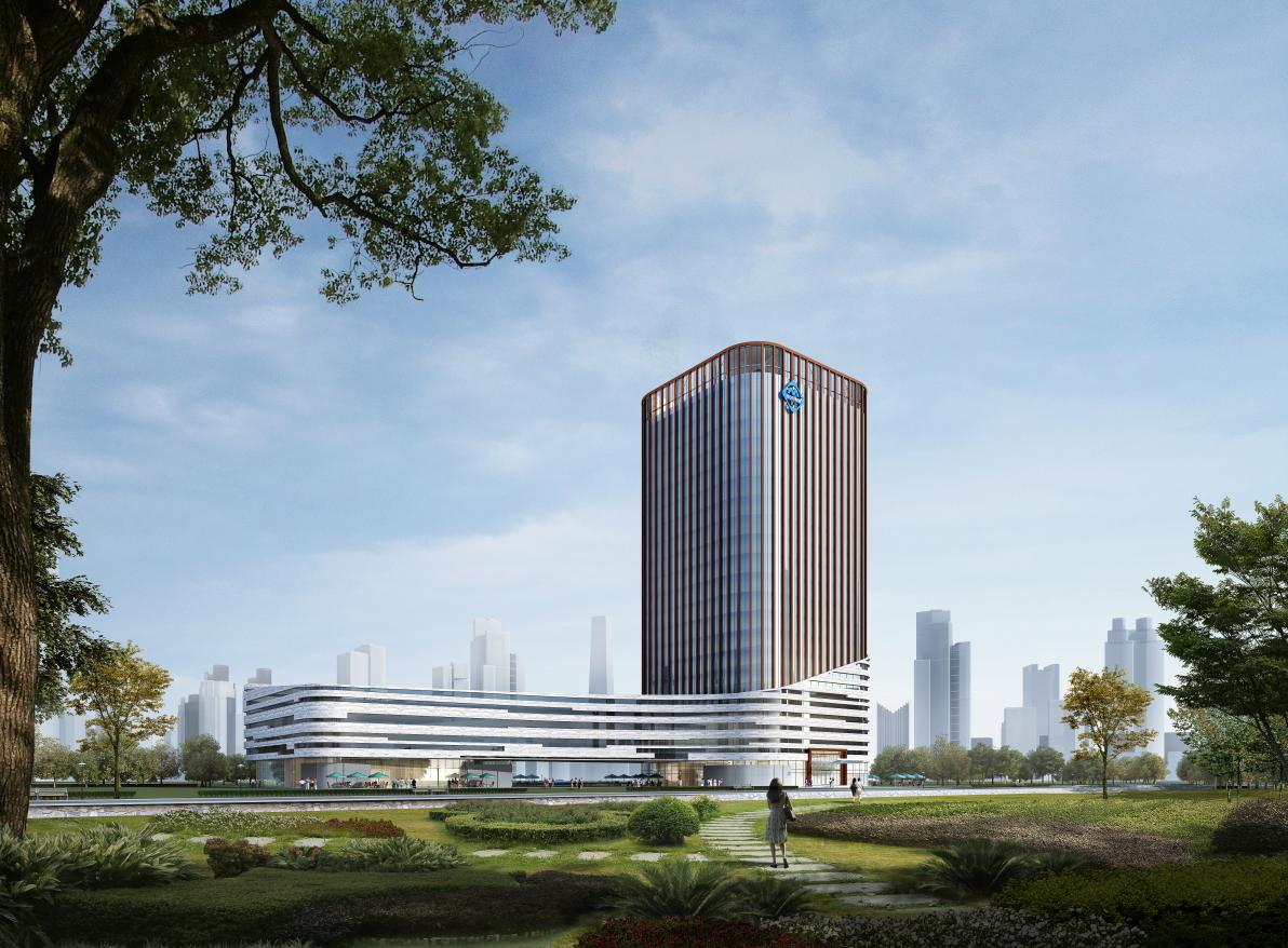 基地是了解集团文化并为科研人员提供舒适工作的地方,是一个体现企业价值并实现未来价值和梦想的场所,设计重点放在创新、明朗的立意上,功能涵盖研发、报告、展示接待、用餐、健身等一站式配套,屋顶及下沉庭院景观为研发人员提供休息交流场所,努力打造一个为员工带来幸福感的建筑。同时要体现出集团的专业特质和行业地位,具有强烈的可识别性。从集团特质出发,挖掘专业属性并与集团文化吻合。以大地的岩层为语言,从矿层挖掘宝藏,壁立千仞无欲则刚,体现集团坚毅和果敢。螺旋上升的岩层充满动感和活力,体现集团勇于开拓、不断创新高的企业精神,矿石晶体结构元素的提取,奉献出的宝藏如钻石一般动人心魄。裙房处理尽可能坚实而低调,与主楼和谐共生,寓意集团上下一心、同心同德,致力打造区域地标。
